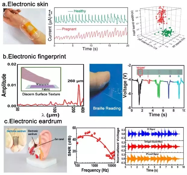 圖3.(a)柔性仿生電子皮膚傳感器(“E-skin”);(b)柔性仿生指紋傳感器(“Electronic fingerprint”);(c)柔性振動傳感器-“電子耳膜(Electronic eardrum)”